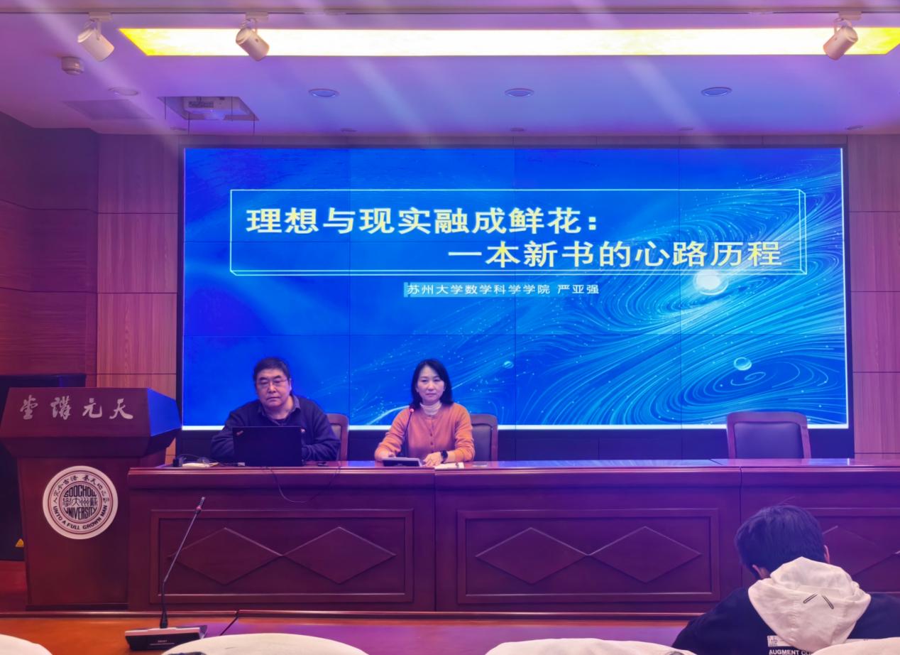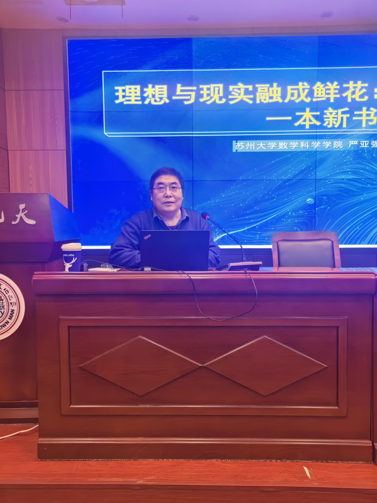 4月26日下午,黄色仓库 退休教师、美国《数学评论》评论员、《中学数学月刊》编委严亚强老师,给黄色仓库 师范专业学生带来了“理想与现实融成鲜花:一本新书的心路历程”的分享讲座。院党委副书记、副院长蒋青芳老师主持讲座。