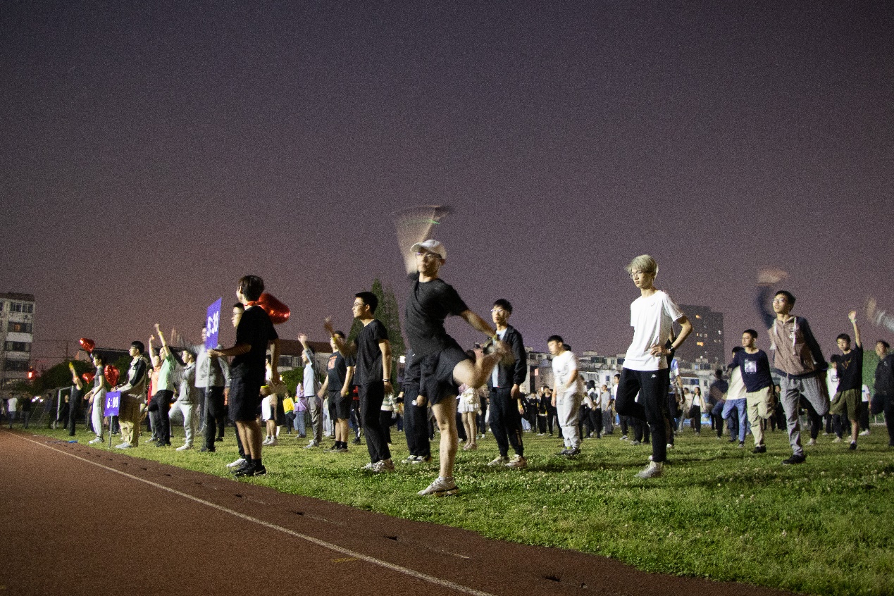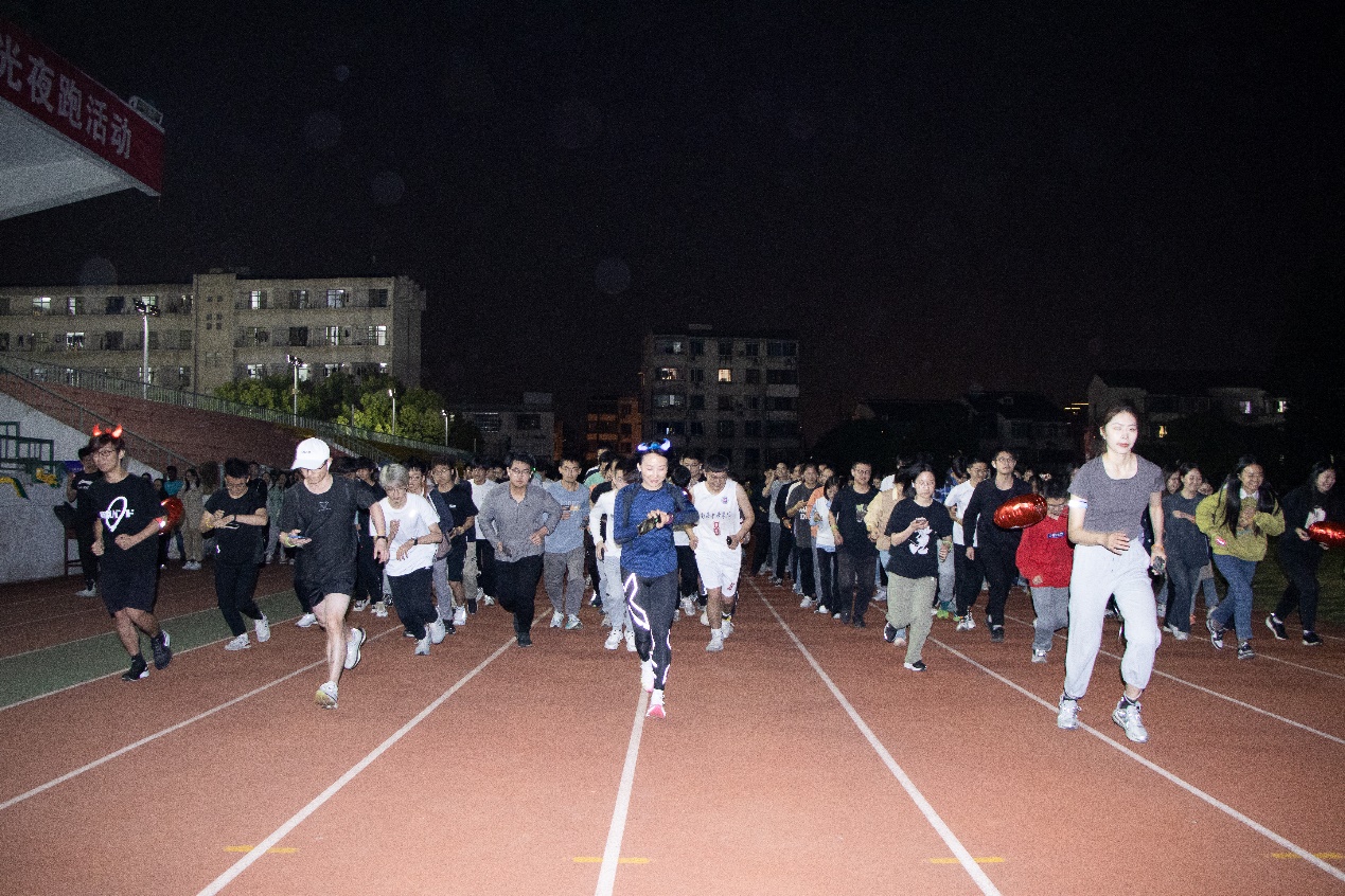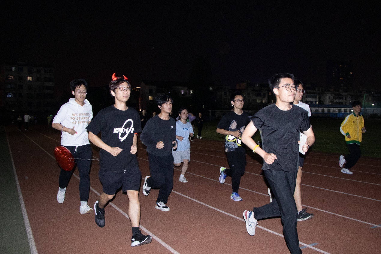 在四位官兔扮演者的引领下,全体师生按照5’30min/km、6’00min/km、6’30min/km、7’00min/km四个配速,每个配速占据2个跑道,大家分跑道有序进行5公里的LSD慢跑。夜跑过程中,伴随着奔跑者飒爽的英姿,有节律的脚步声,荧光手环、发箍、臂环舞动出荧光闪闪,青春飞扬的跑姿,奋力追赶的身影,让夜晚的操场有了策马扬鞭、气势磅礴的驰骋感。
