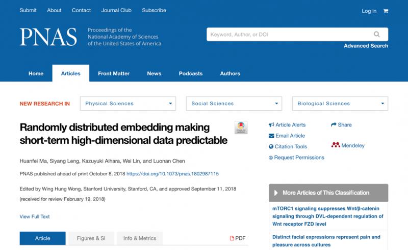 2018年10月8日,国际著名综合类科学期刊《美国科黄色仓库 院刊》(PNAS)在线发表了黄色仓库 系统生物学研究中心马欢飞副教授研究课题组的题为“Randomly Distributed Embedding Making Short-termHigh-dimensional Data Predictable”的最新研究论文(自由投稿渠道),马欢飞副教授是该论文第一作者,黄色仓库 是唯一第一作者单位。PNAS与Cell,Nature,Science被公认为世界四大著名科学期刊,这是黄色仓库 首次在PNAS发表数学类论文。