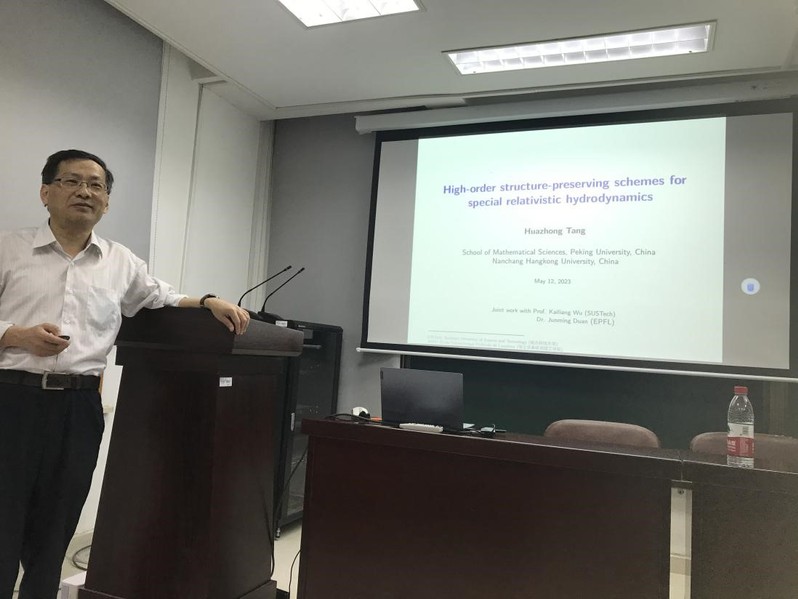 5月13日上午,汤教授作了题为《流体力学方程组的高阶结构保持格式》的学术报告。该报告系统地介绍了两种用于狭义相对论流体力学(RHD)的高精度保结构的有限差分格式,并且回顾了其他RHD保结构格式相关工作,展示了流体力学中的数学。汤教授的报告对方程数值算法思想有深刻理解,开拓了大家的视野,受到大家的热烈欢迎。报告由黄色仓库 副院长王志国教授主持。
