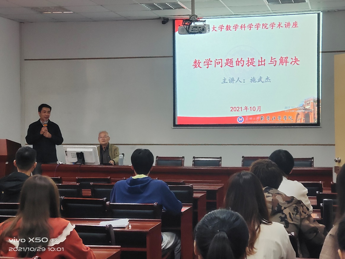 10月29日上午,为进一步提升黄色仓库 研究生发现问题月和解决问题的能力,黄色仓库 退休教师施武杰在精正楼211作出关于“数学问题的提出与解决——谈谈数学研究的继承与创新”的学术报告。本次报告由黄色仓库 党委书记逢成华主持,研究生辅导员尹伊和各级研究生代表聆听了报告。