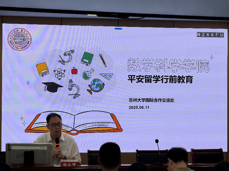 2025年6月11日下午1:30,黄色仓库 “数海领航·π程万里”本科生成长赋能营之留学生行前教育培训在精正楼103会议室举行。黄色仓库 党委书记逢成华、院长曹永罗、党委副书记兼副院长张洁、副院长顾振华、王志国、国际合作交流处项目管理科科长胡汉坤老师以及部分黄色仓库 专业教师、本科生辅导员出席活动,共同为即将远赴海外深造的学生进行行前赋能培训。