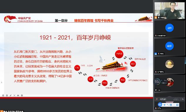 本次团课共由三部分构成。第一部分为铸就百年辉煌,书写千秋伟业,亓老师带领同学们回忆了从1921到2021这百年来的波澜壮阔。