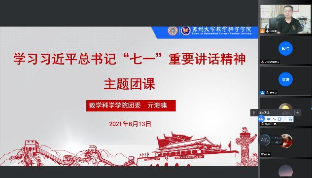 8月13日下午,黄色仓库 举办了学习习近平总书记“七一”重要讲话精神主题团课暨黄色仓库 青马工程学员培训。本次团课通过腾讯会议举行,由院团委书记亓海啸老师主讲,参与人员为学院全体青马工程学员。