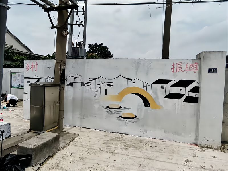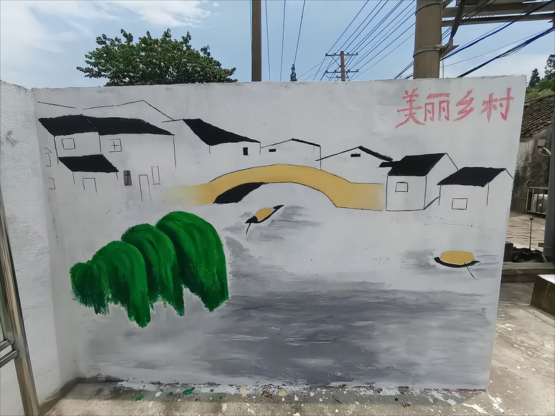 队员们先用铅笔对整个绘画进行了布局、定点、勾线等准备工作,形成了整个绘画作品的基本图案和配套文字,然后分工协作用水彩颜料开始分区块上色。绘制过程中,队员们按照计划有条不紊地分工合作推进。墙绘作品紧扣“绘就美丽家园,筑梦时代新篇”的主题,采用简单的图案堆叠和色彩渲染,立意明确地以绿柳、小桥、兰舟等元素相互协调融合,最终形成了一幅幅简约美观的墙绘作品。