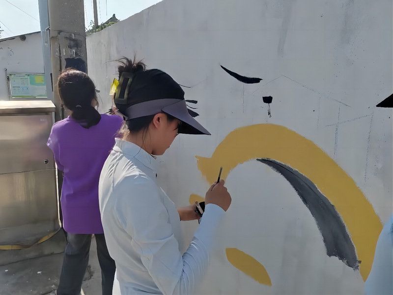 在绘画过程中,实践团遇到了诸多困难。墙面由于缺乏维护与修缮,有小部分墙面出现白漆脱落、褪色的情况,队员们先拿小刷子和铲刀对墙面的灰尘和粘性附着物进行了大致的清理,然后用带来的白色颜料对墙面进行了整体的刷白工作。同时还面临着夏日的苏州气温炎热、突如其来的大雨阻碍室外墙绘工作进行以及雨水将墙面未完成的绘画作品冲刷掉等重重困难。