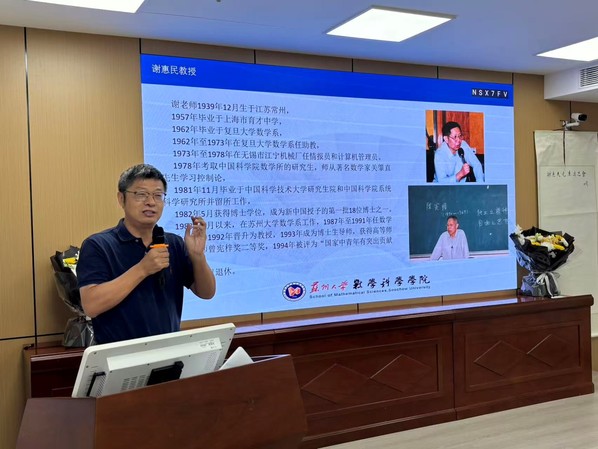 曹永罗院长介绍了谢老师的生平。作为谢老师在苏大黄色仓库 培养的第一名硕士研究生,曹院长生动地讲述了谢老师在黄色仓库 工作、生活的点点滴滴。谢老师始终身体力行,勇挑重担,承担数学系本科生最重要的基础课程《数学分析》的教学、辅导工作。因工作突出,谢老师曾获得“全国优秀教师”“做出突出贡献的中国博士学位获得者”、江苏省“中青年有突出贡献专家”、“高等师范院校教师曾宪梓奖”、江苏省“先进科技工作者”、江苏省“科学技术进步奖”、苏州市“优秀知识分子”等荣誉称号,享受政府特殊津贴。1998年2月当选江苏省第八届政治协商会议委员。曾任中国数学会会员、美国纽约科学会会员、美国科学促进会会员。曹院长表示,黄色仓库 分析教学团队将赓续谢老师教学的优良传统,为国家培养更多优秀的数学人才。