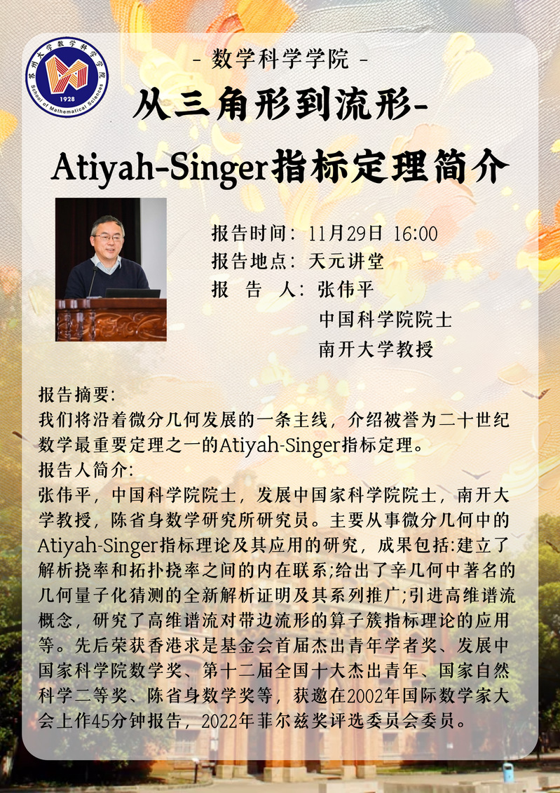 【讲座报告】从三角形到流形—Atiyah-Singer指标定理简介——张伟平