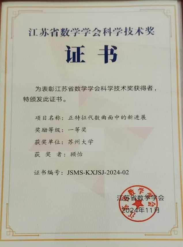 顾怡教授荣获江苏省数学学会科学技术奖一等奖