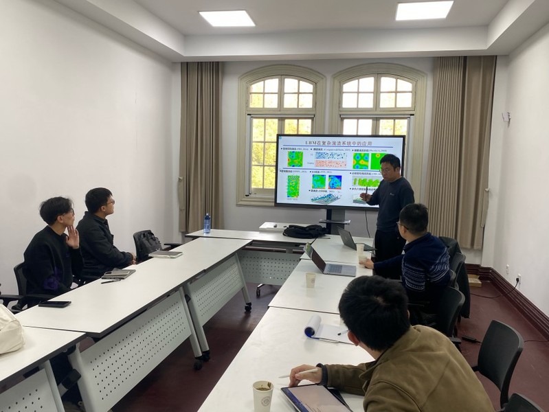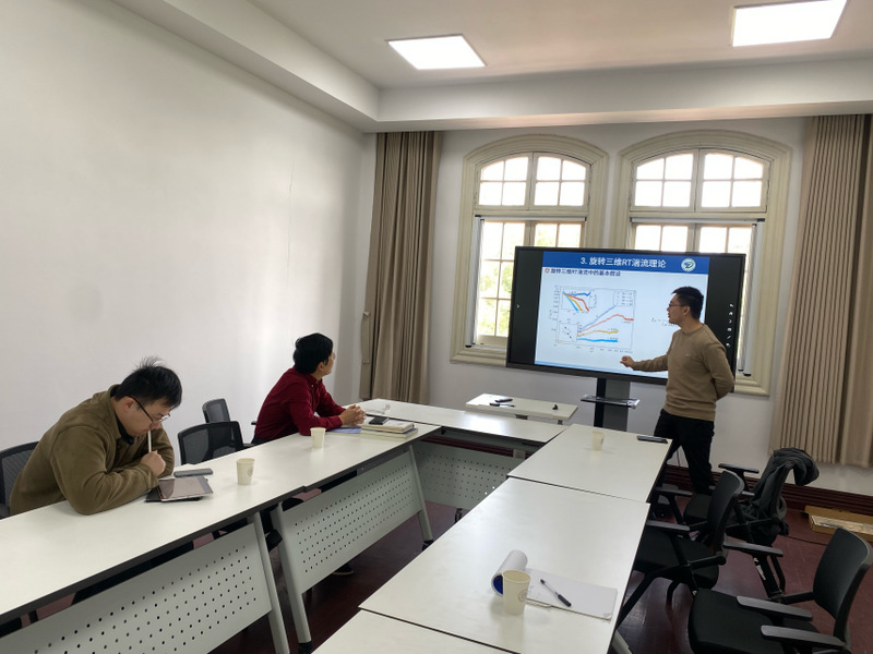 王政道博士首先分享了旋转条件下Rayleigh-Taylor湍流理论研究与数值模拟的最新进展。随后,夏玉显博士介绍了格子玻尔兹曼方法在复杂湍流系统中的多项应用。两场报告均围绕格子玻尔兹曼方法的前沿应用展开,充分展现了该方法在湍流研究领域的广泛适用性和持续创新能力。两位报告人与参会的老师和同学进行了充分的交流与探讨,钱跃竑教授高度肯定了两位报告人的工作,并表示希望未来能够进一步深化双方在相关领域的学术合作与交流。