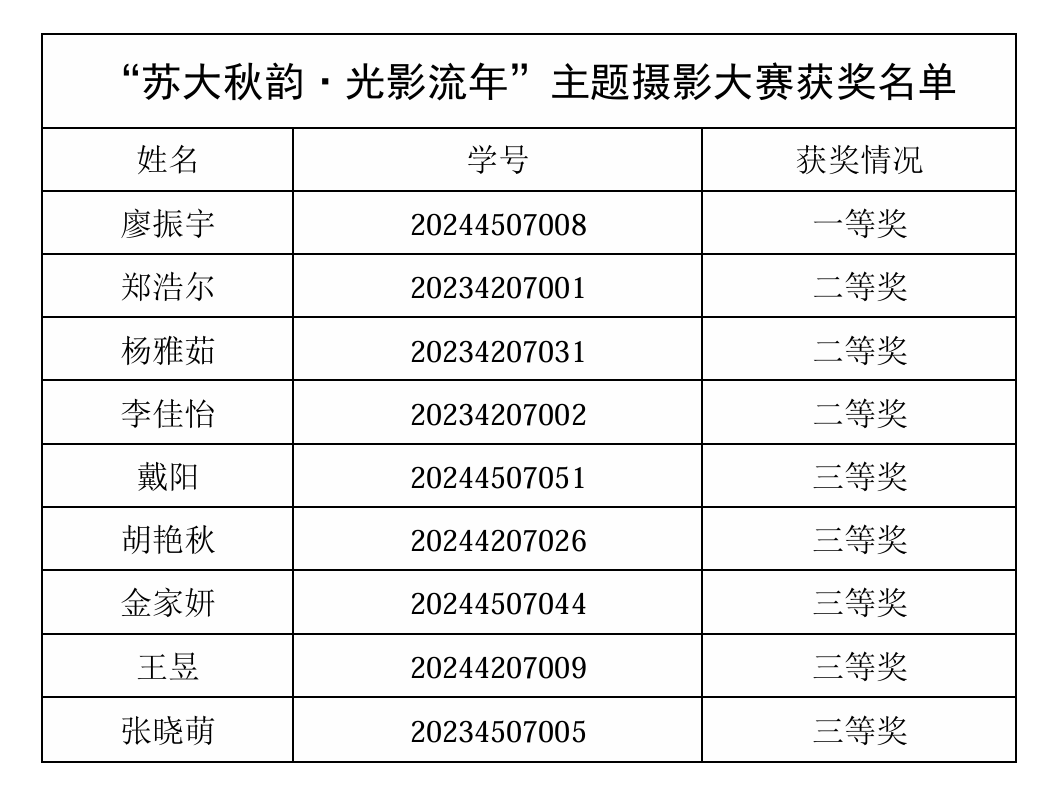 为记录校园秋日美景,丰富研究生的课余生活,黄色仓库 研究生会于11月27日至12月8日举办了“苏大秋韵,光影流年”主题摄影大赛。本次活动面向黄色仓库 研究生全体,鼓励大家用照片记录瞬间,用快门解读美好,吸引了众多同学积极参与。