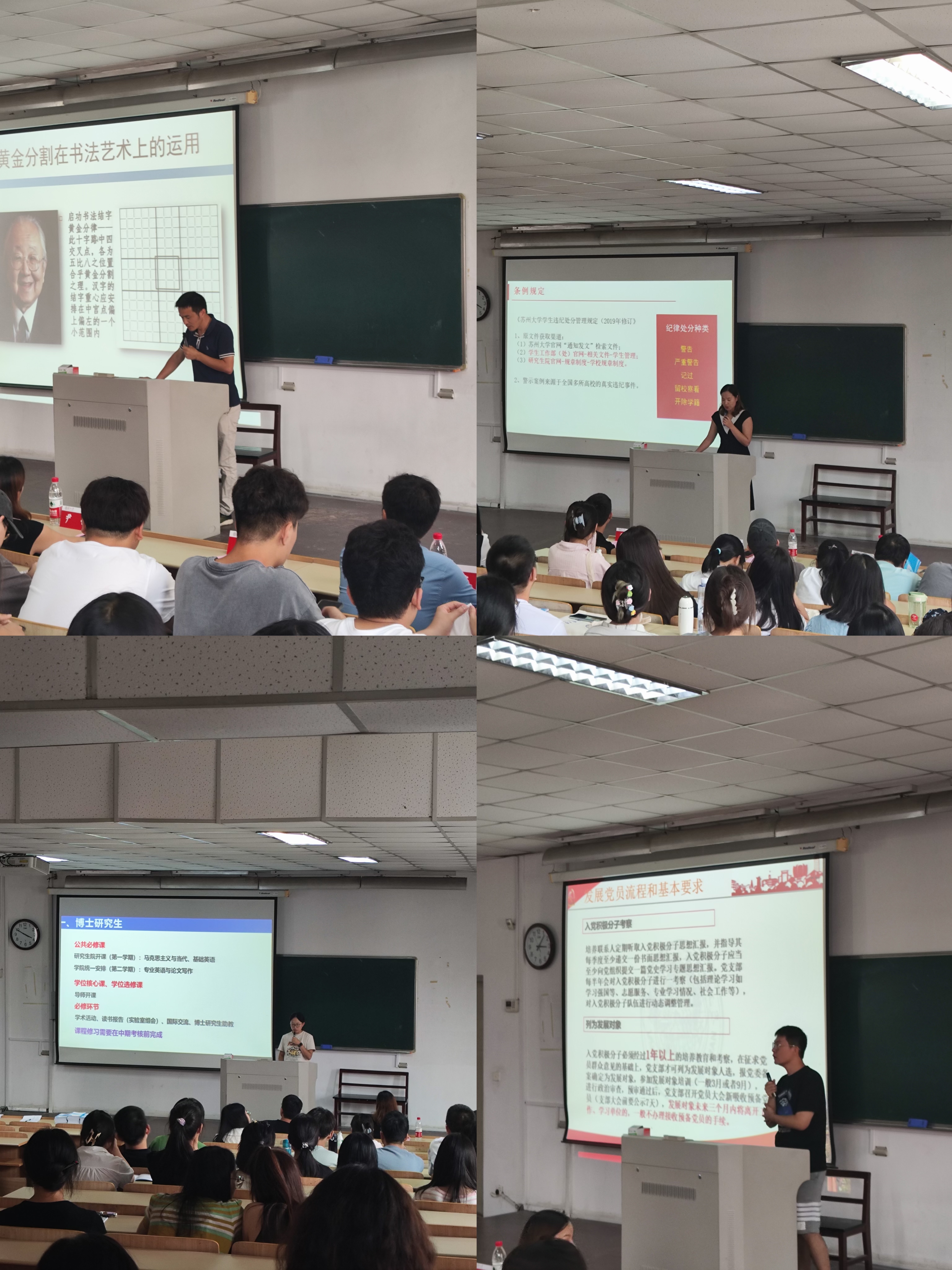 随后,党委组织委员乔治、学工办副主任尹伊、教务秘书王梦婷、研究生专职辅导员曾峥分别以党员发展、纪律规范、选课注意事项、奖助贷政策为主题进行讲述。在同学们热烈的掌声中,黄色仓库 2023级研究生入学教育会议圆满完成。