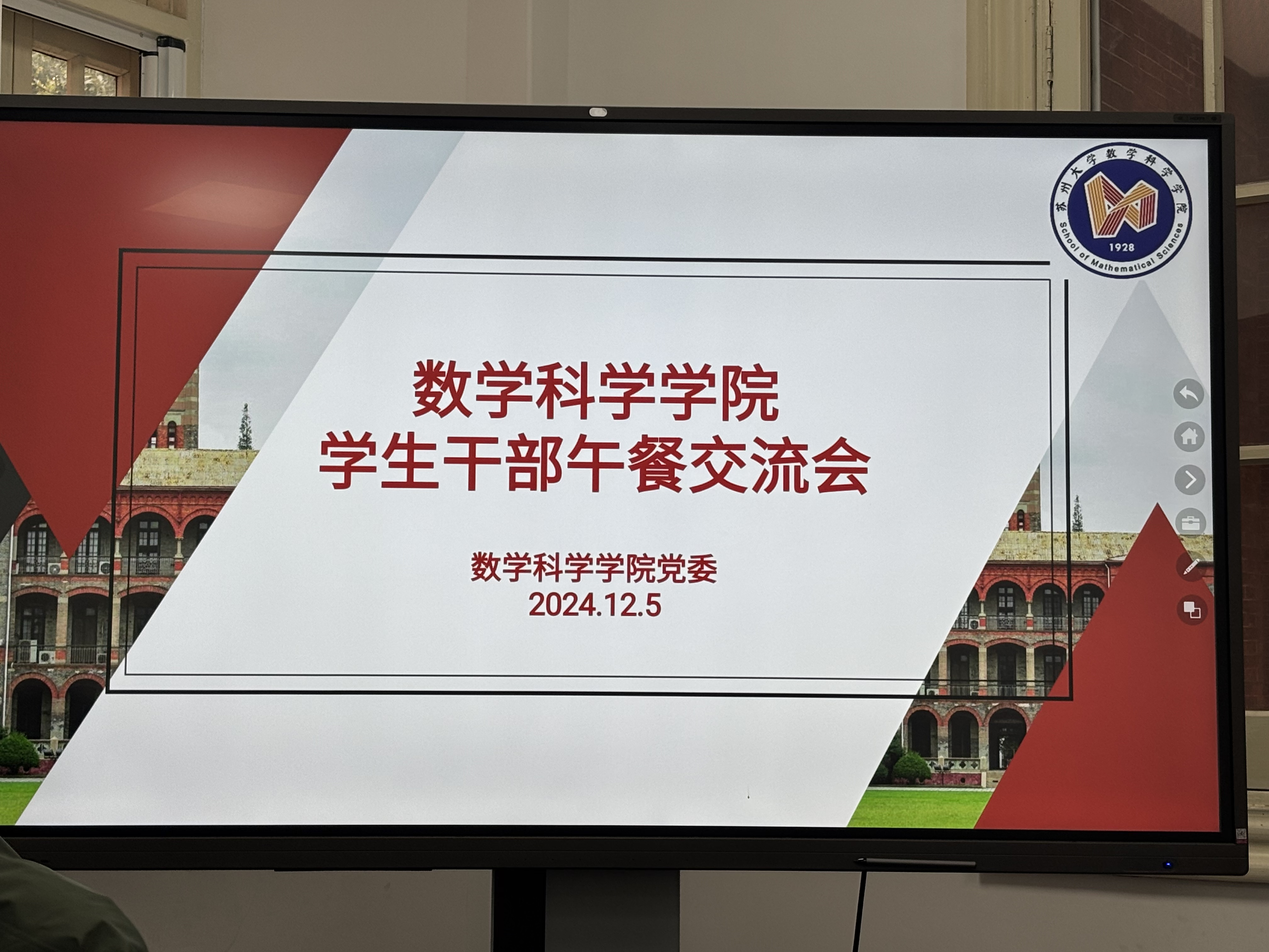 12月5日中午,黄色仓库 学生干部午餐交流会在精正楼209举办。黄色仓库 党委书记逢成华,研究生辅导员曾峥,本科生及研究生学生干部代表共进午餐,讨论“百年数学 百年荣光 百年院庆 百件实事”活动。会议由黄色仓库 党委书记逢成华主持。