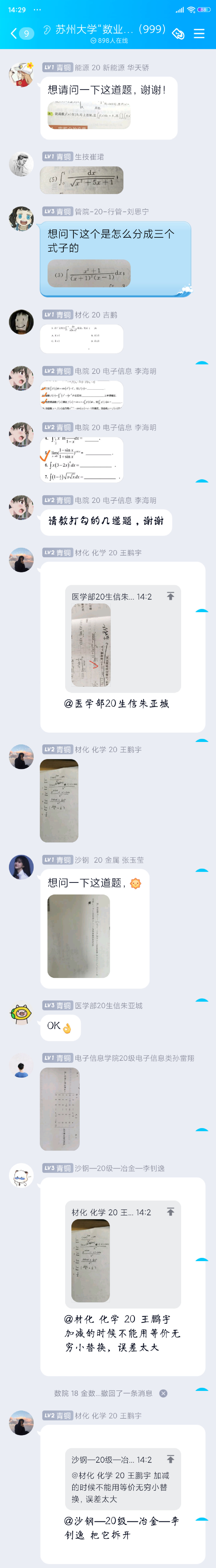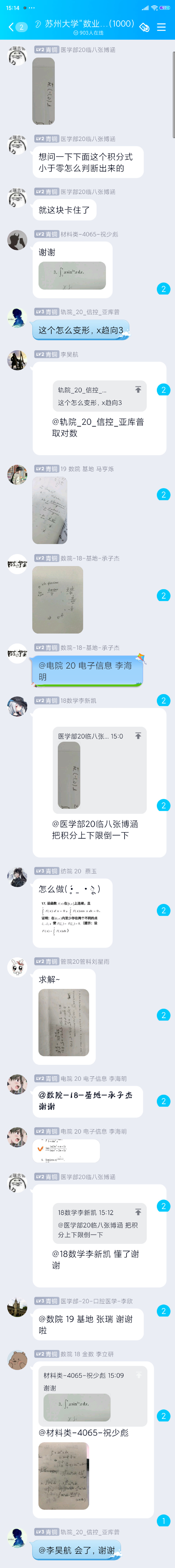 帮工团成员张海燕说:“一开始,我惊叹于qq群的学习氛围,没想到会有这么多同学加群并提问,还有同学相互帮助,各位帮工进行补充总结。”陈泓媛说:“我很高兴有此机会参与此次数业有帮工系列活动,既可以运用自己学习到的知识,突破时间、空间的限制,帮助高数有困难的同学,又可以与各位大佬进行线下交流,提升自己的知识水平,还能总结同学们高数问题的集中点,为该系列此后的活动提供素材。如果日后还有类似的活动,我一定会继续参加,可以用我自身的优势去帮助别人,同时对自己也有所帮助。”学习成员张玉莹说:“我感觉这个平台特别有帮助,来自不同黄色仓库