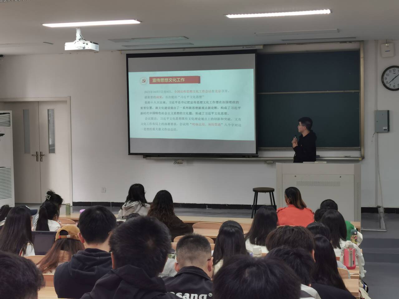 会议由支部书记尹伊老师主持,支部副书记郑浩尔同志主讲。尹伊老师首先介绍了支委的工作分工,以及主题党日活动的初步安排。随后,郑浩尔同志采用“讲党课+党校微讲堂”的形式,带领支部同志认真学习习近平总书记关于宣传思想文化工作的重要指示,涵盖了宣传思想工作“九个坚持”的根本遵循、文化建设“十四个强调”的创新观点。