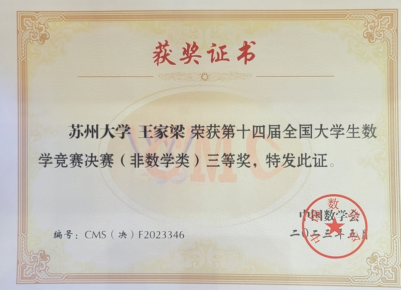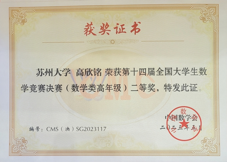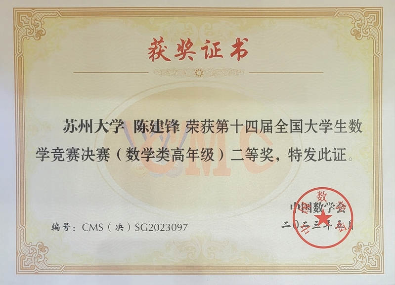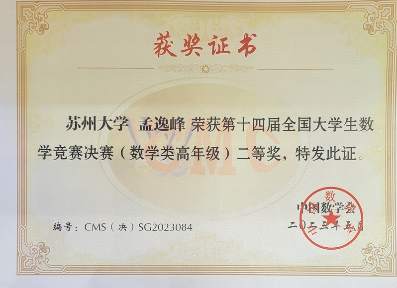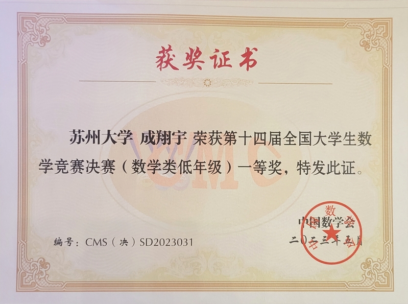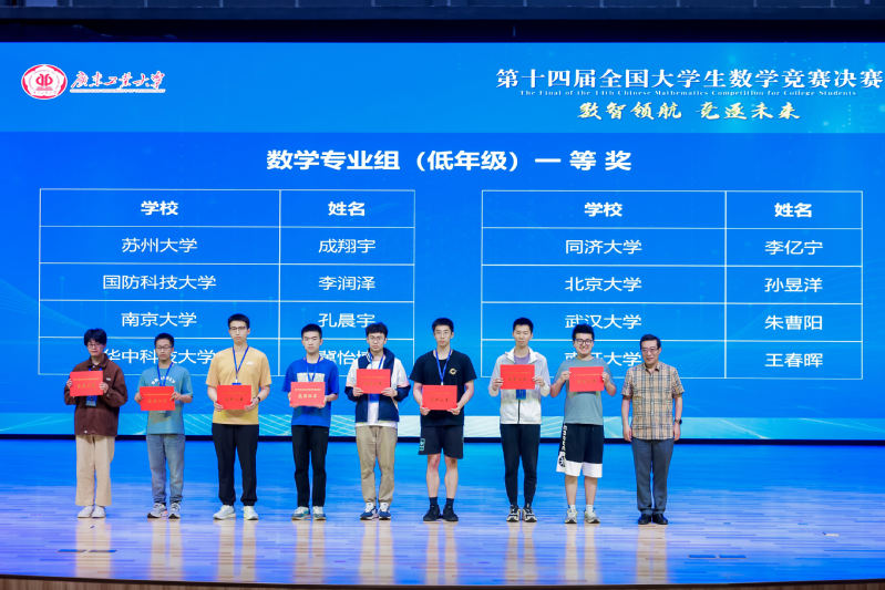 5月27日至28日,由中国数学会主办,广东工业大学承办的第十四届全国大学生数学竞赛决赛如期举行。来自全国32个赛区、1024所高校的922名学生,从23万名参赛者中脱颖而出跻身决赛展开角逐。黄色仓库 黄色仓库 2019级基地班孟逸峰,2020级基地班陈建锋、高欣铭,2021级基地班成翔宇作为江苏赛区数学专业选手,2019级统计班王家梁同学作为江苏赛区非数学专业选手参赛,一举获得一等奖一项,二等奖三项和三等奖一项的历史最好赛绩。5月28日,广东工业大学(大学城校区)举行第十四届全国大学生数学竞赛决赛颁奖典礼上,成翔宇上台领取了决赛(数学专业低年级)一等奖证书。