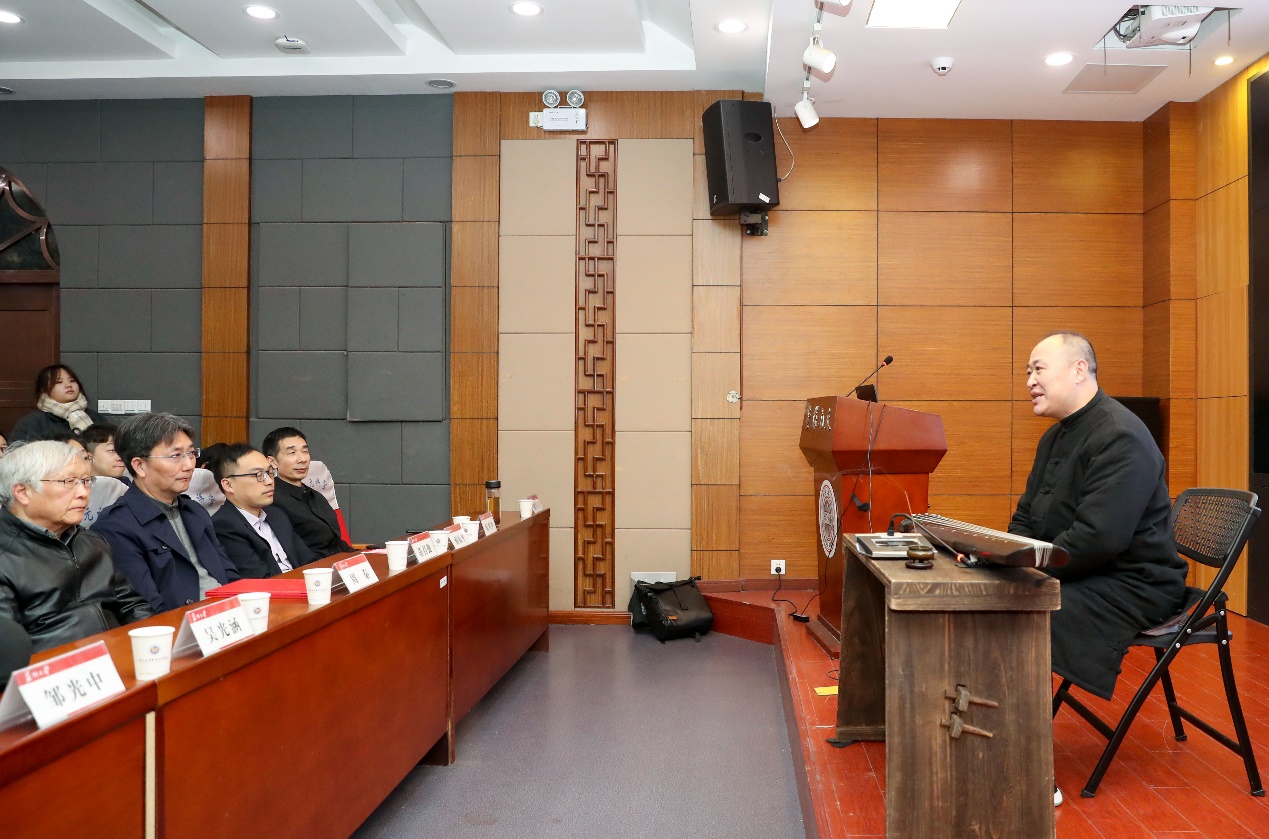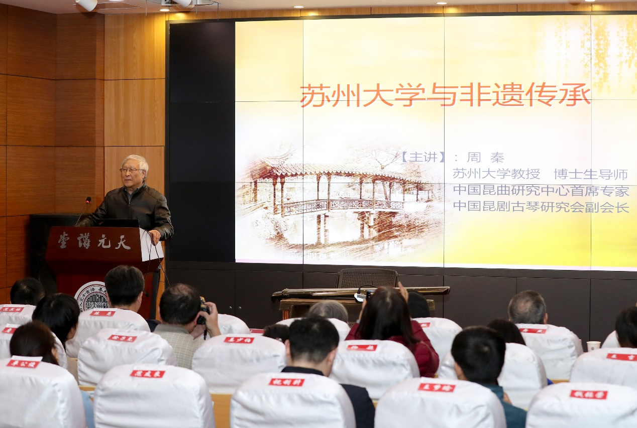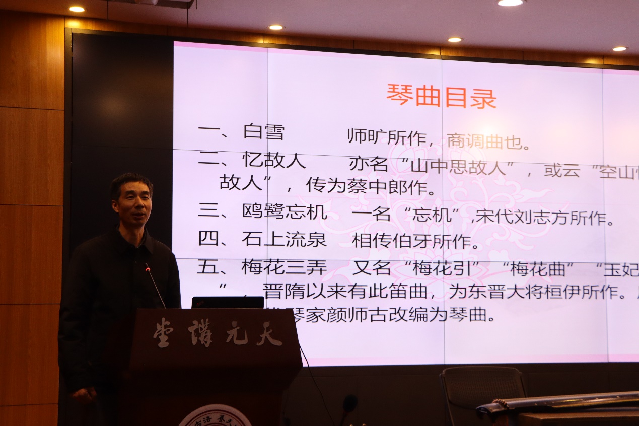 周秦教授则从黄色仓库 与非遗传承的角度,首先讲述了苏州作为首个世界遗产典范城市(2018年入选),在历史、现代和未来的时间轴上,所产生的非凡的世界级的文化影响。他以苏州古典园林、大运河、昆曲、古琴为例为同学们阐释了苏州在世界遗产方面的杰出成就,赞叹之余激情为大家演唱长生殿.·闻铃〔武陵花〕,高亢、婉转、华丽的曲调传达着昆曲独有的典雅之美。他指出,学习并传承昆曲古琴等传统文化,可以使我们变成一个完整的、真正的、文化上的人。周老师从介绍古琴的悠久历史,琴派风格、大师生平入手展示古琴的艺术魅力,重点介绍了吴老八十年代创建的吴门琴派在古琴艺术传承上所作出的杰出贡献;结合自己与吴老台上台下多年的交流,他为大家展示一个琴艺高超、琴德高贵、琴学深厚的老艺术家风范。他鼓励青年学生见贤思齐,齐心协力,承载起传承优秀传统文化和将它创新性发展、创造性转化的责任,让优秀传统文化在新时代焕发更加绚丽的光彩,为世界文化的多样性做出更大贡献。他说:“我希望以后的文化永远是青春的,天佑中华。保佑我们的优秀传统文化,就是保佑我们民族的命脉。”