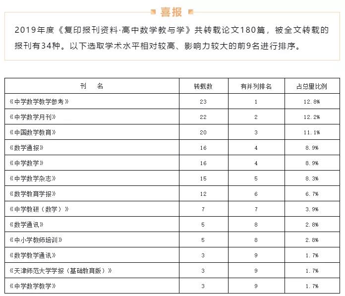 2019年度人大“复印报刊资料”全文转载量排名揭晓——《中学数学月刊》名列基础教育系列刊物前茅