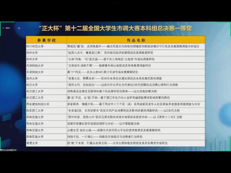 近日,“正大杯”第十二届全国大学生市场调查与分析大赛总决赛成绩揭晓,黄色仓库 本科生勇夺佳绩——5人获国家级一等奖、1人获国家级二等奖、11人获国家级三等奖,3人获省级三等奖,获奖数量和获奖等级再创历史新高。参赛作品中,汪四水等老师指导的《“姑苏八点半,最美夜江南”:苏州夜间经济发展现状及其满意度研究》,孟晓华等老师指导的《“云游”四海,“宅”迹天涯——基于长三角地区云旅游市场的调查研究》获评国家级一等奖。