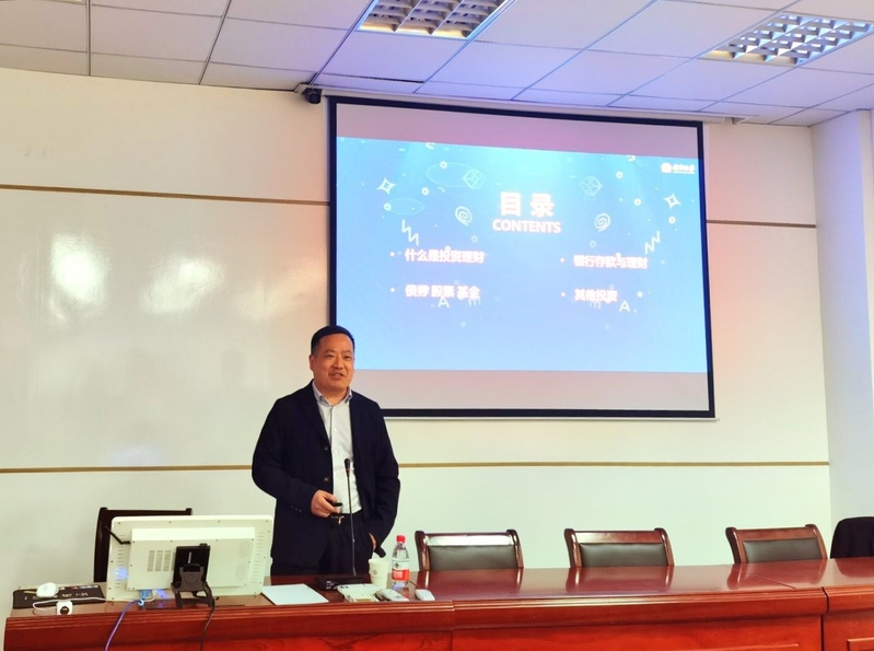 闫经理用通俗易懂的语言解释了银行存款、活期存款、定期存款、利率、利息等概念,演示了现行利率与算法。接着,闫坤经理着重分析了债券、股票、基金等风险高、收益大的投资手段,并举出经典股票交易图、个人经历,来讲述股票变化的不确定性。最后,闫经理强调了投资理财的好处和风险并存,提醒同学谨防金融诈骗,并提到理财不是赌博,需要理性地选择,而选择的依据溯源于数学,因此同学们应加强专业学习,打好数学基础。