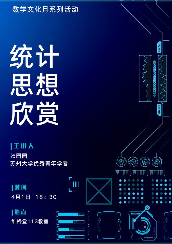 4月1日晚,黄色仓库 数学文化月系列活动——“统计思想欣赏”专题讲座在维格堂113教室举行,此次讲座由黄色仓库 优秀青年学者张园园主讲,为同学们介绍了数据与统计学的联系以及统计学在生活中的实际应用。