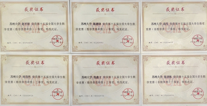 2022级数学与应用数学(基地)专业赵平原同学获数学类低年级组一等奖 (江苏高校排名第一); 2022级数学与应用数学(基地)专业时浩然、倪鑫文同学获数学类低年级组三等奖。