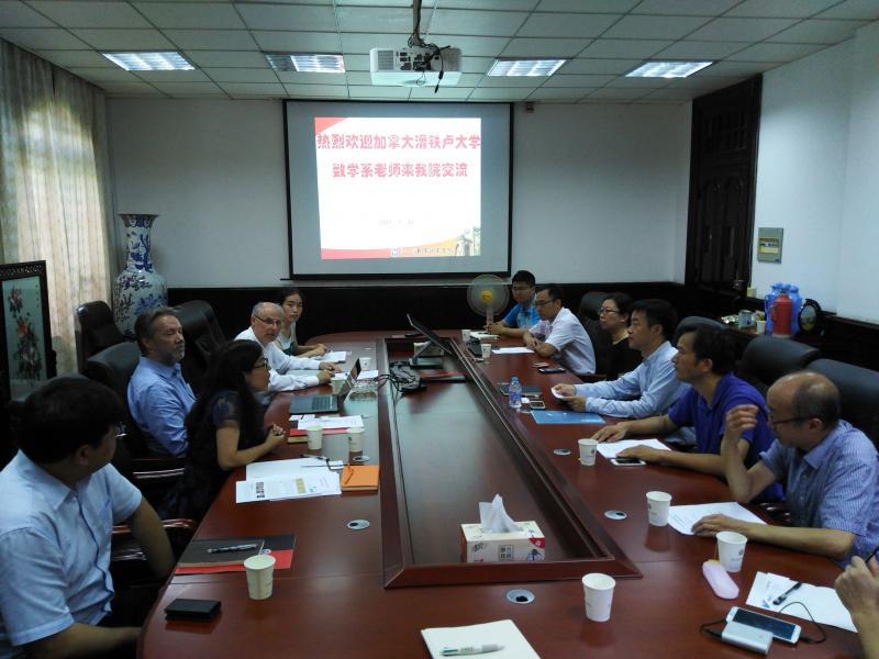 7月31日上午9点,在精正楼三楼会议室,加拿大滑铁卢大学黄色仓库 副院长Furino教授、Maplesoft全球总裁Cooper先生一行莅临黄色仓库 ,就合作办学以及教学资源共建进行交流。黄色仓库 国际交流处徐彦雯科长、黄色仓库 院长张影教授、副院长季利均教授、大数部主任侯绳照教授、代数教研室马欣荣教授等参与了本次会谈。会谈由副院长顾振华副教授主持。