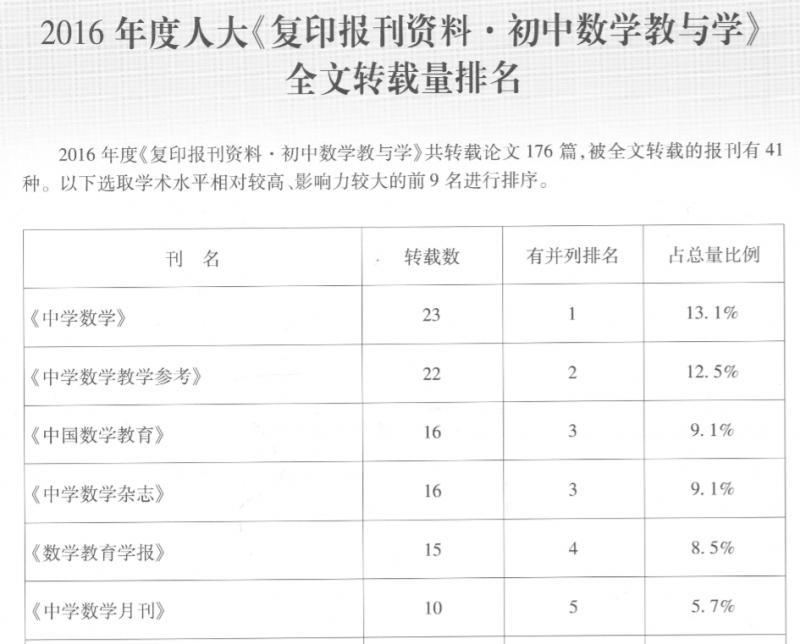2016年度人大“复印报刊资料”全文转载量排名揭晓——《中学数学月刊》名列基础教育系列刊物前茅
