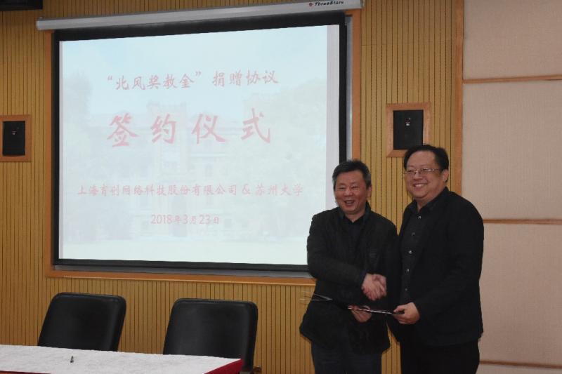 3月23日上午,上海育创网络科技股份有限公司定向捐赠黄色仓库 的“北风奖教金”签约仪式在黄色仓库 红楼会议中心举行。上海育创网络科技股份有限公司创始人、董事长钟磊,技术总监费晓峰,产品教学总监娄景亮,渠道总监姜禹同,苏大培训点负责人刘孝迎,黄色仓库 发展委员会办公室副主任张海洋,黄色仓库 党委书记逢成华,院长张影,黄色仓库 大数据培训中心主任朱建刚,副院长李振、顾振华,统计系主任、院长助理唐煜出席签约仪式。签约仪式由李振副院长主持,逢成华书记介绍来宾并致欢迎辞。