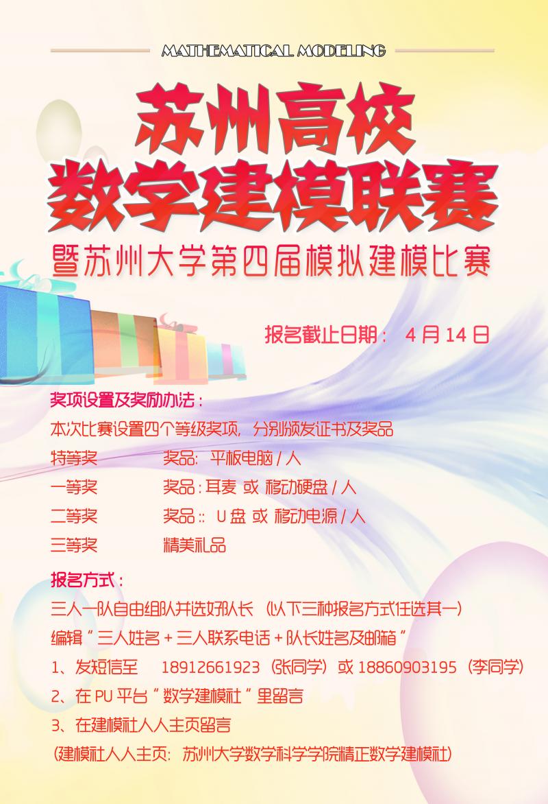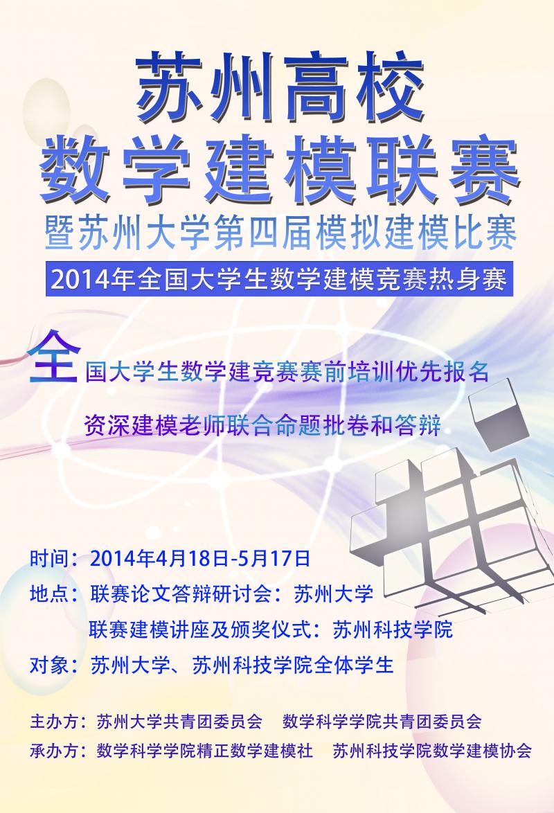 联合举办苏州高校数学建模联赛,给大学生提供更多的锻炼平台和参赛机会,以此鼓励广大学生踊跃参加课外科技活动,开拓知识面,培养创造精神及合作意识。