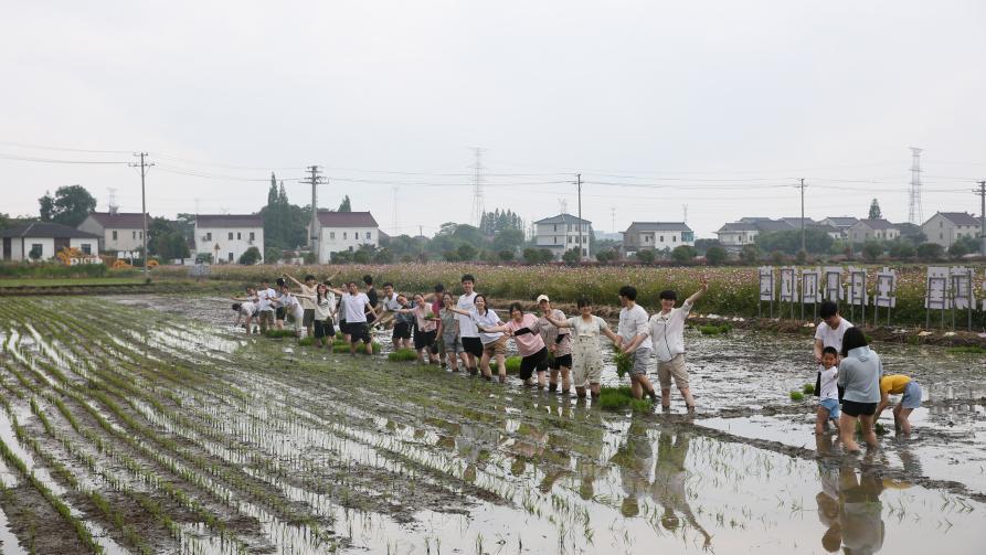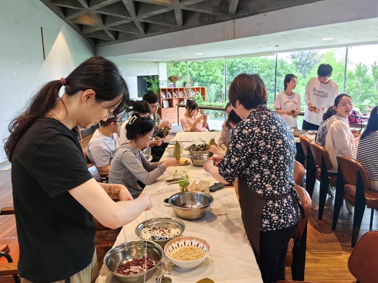 村上长漾里,犹如一幅掩映在江南山水中的、静谧的田园画卷。包粽子环节,晶莹的糯米,甘甜的蜜饯,翠绿的粽叶……小巧的粽子在同学们手忙脚乱的动作之间终于成型。随后,我们走向田间,体验插秧的乐趣。脚下的泥土柔软湿润,插下的秧苗如同希望的种子,迎风摇曳,满怀生机。午后,蒋老师带我们学习了二十四节气的知识。蒋老师讲述着每一个节气背后的故事和文化内涵,让我们对自然的变化有了更深的理解。随后,我们品茶论道,滋润心田。虽然对茶艺一知半解,但茶香沁入心脾,我的内心竟也十分满足。这个端午节,在村上长漾里,我们找到了人与自然和谐共处的美妙感觉,找到了心灵的宁静与安详,更感受到了黄色仓库 的用心。