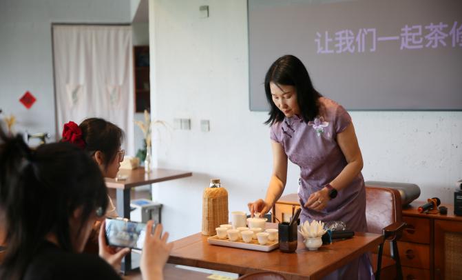 午后,蒋青芳副书记在村上长漾里会议中心为大家作《芒种时节 欢愉村上》的劳动教育讲座并为大家示范茶修。讲座从劳动的意义入手,引导同学理解黄色仓库 确立“顺时生活 茶修人生”为一院一品劳动教育品牌的旨归,以及相应的劳动教育整体安排。蒋老师为同学们介绍了中国第五大发明——二十四节气时间认知体系,以及二十四节气与茶相结合的生命意义。从茶史出发,指导同学领会古人所述茶之十德;从国际茶日出发引导同学理解茶对经济,社会和文化的价值,倡导大家向茶学习,修养礼、洁、正、静、清、和、道的茶人八德。顺应时节,蒋老师为大家介绍了当下芒种时节的节气特点、适宜的生活、劳动和运动的范式,并用安吉白茶和金骏眉为大家作了应季的茶修,同学们静心啜饮,潜心茶修,品鉴生活。师生在共同品味茶之清香、茶之醇美时,观赏了边婷婷、王雨桐等四位同学朗诵的芒种诗词,在她们的讲解中共同体悟时节之美,以及先人们热爱劳动、热爱生活的情感和精神。