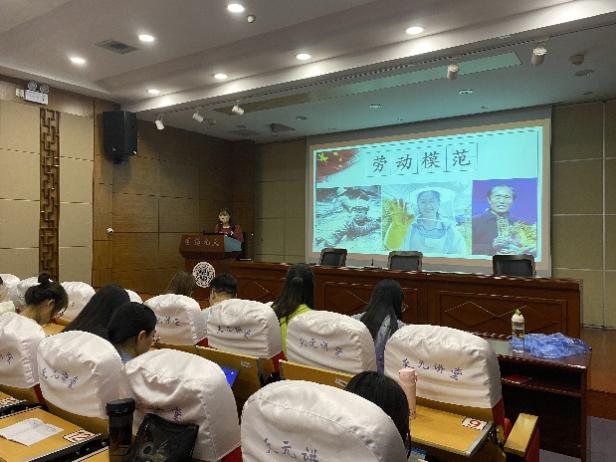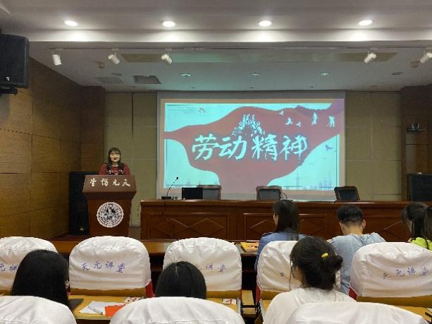 首先,由学科教学(数学)专业的王倩同学进行汇报。王倩同学从劳动模范人物、劳动精神内涵和弘扬劳动精神三个方面对几位劳动模范进行了介绍,并在结尾时运用党史学习题库与党员们互动,让大家积极参与到了劳动精神的学习中。
