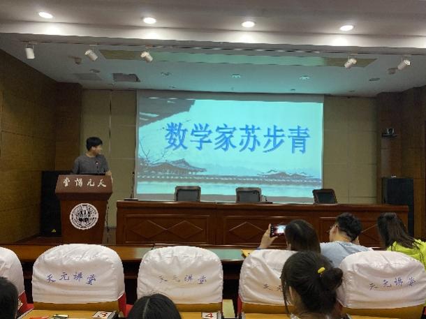 之后,数学专业的朱英贤同学向大家介绍了伟大的爱国数学家苏步青先生。通过他的讲解,大家了解了苏步青先生在数学领域做出的贡献,和他毅然从日本归来报效祖国的爱国事迹,让我们切实感受到苏步青先生“为中华之崛起而读书”的爱国精神。