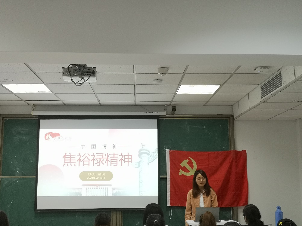 最后,统计专业的范贝贝同学为大家解析焦裕禄精神的时代价值以及精髓。从服务群众、艰苦奋斗、求真务实、知难而进和敬业奉献五个方面解析了焦裕禄精神,并且带领大家学习了焦裕禄精神爱党、爱国,热爱新社会和以民为本,执政为民,甘做公仆的焦裕禄精神的精髓。