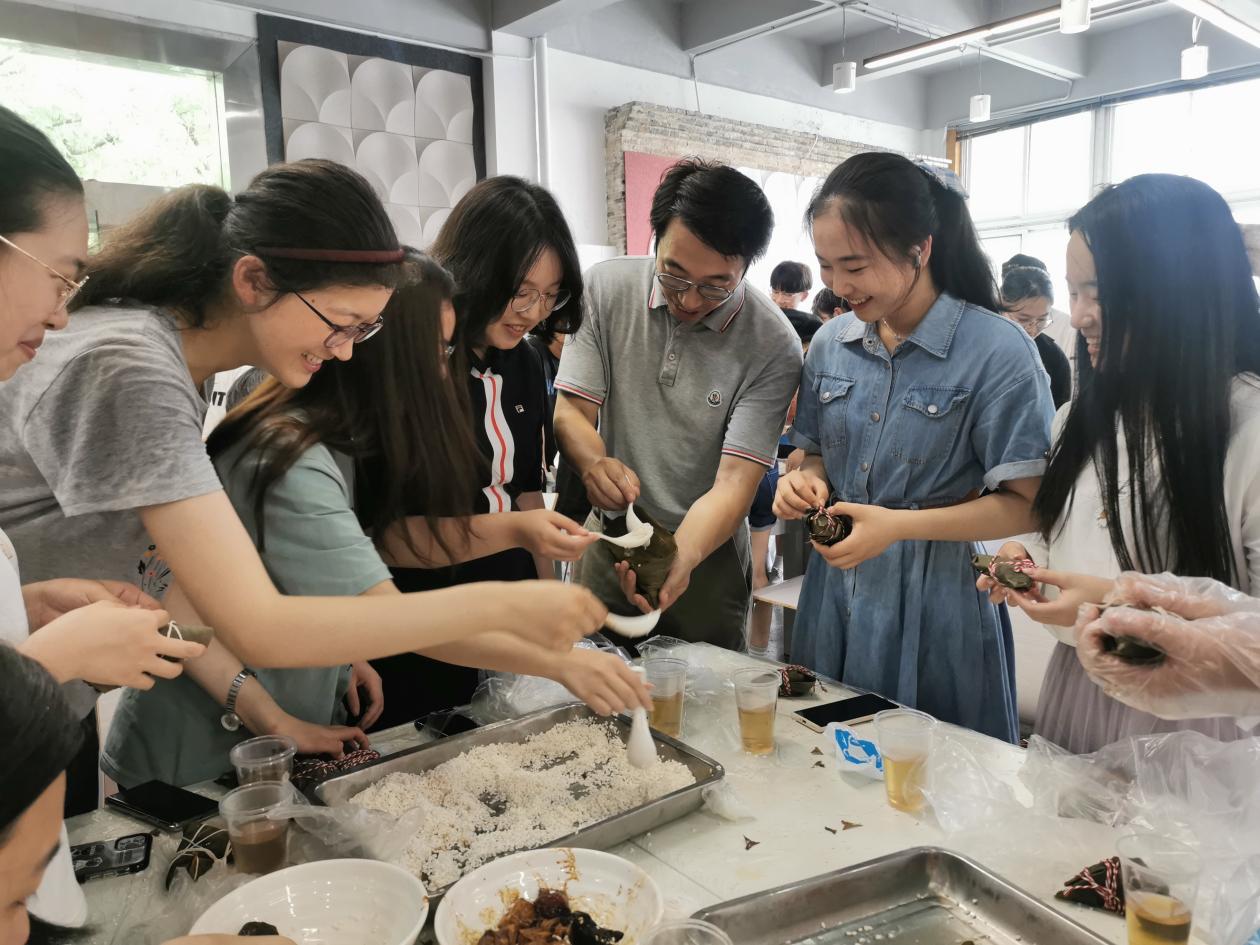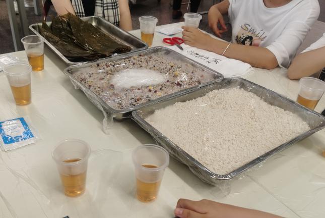 同学和老师陆续到场后,整个方塔食堂热闹起来。工作人员早已在长桌上摆好糯米、粽叶,豆沙,蜜枣,八宝、酱汁肉四种粽馅儿,一次性围裙、四色扎线也都准备齐全。参加包粽的老师和同学们一起把手洗净,撸起袖子围着长桌忙活起来:“熟练工”娴熟地折起粽叶,卷成卷,舀起一勺糯米,慢慢往粽卷里倒,倒一半糯米埋进一粒蜜枣,撒下一捏红小豆,再用米将粽子填平,缓缓地封好粽子;无从下手的学生有的眼巴巴地盯着不锈钢盘里包好的完整的粽子,泛着青翠的光泽,有的看着食堂阿姨的动作,希望“偷师”学艺。