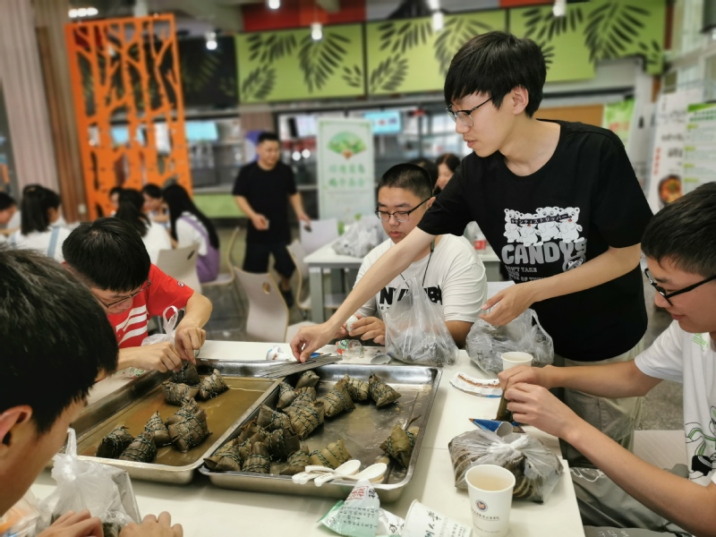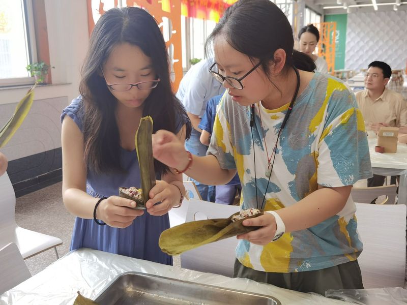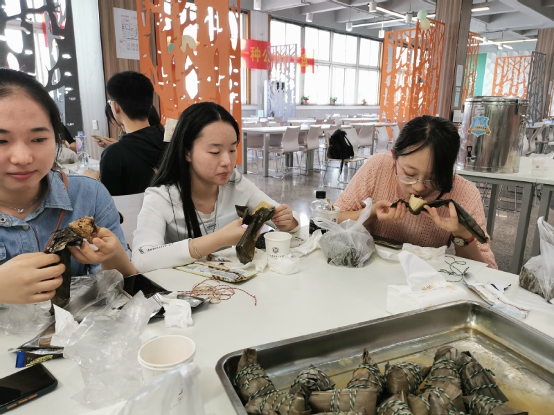 粽子煮好上桌,大家都饶有趣味地寻找带有自己专属符号的私人订制。绳子解开,粽叶剥离,粽叶和糯米特有的香味充盈方塔食堂。大家吃着自己亲手包裹的粽子,交换喂食各钟口味,充分享受着自己的劳动成果,师生互品,其乐融融。