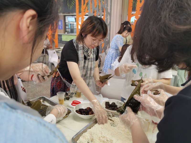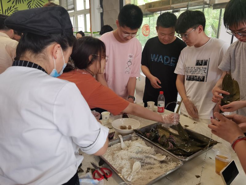同学和老师陆续到场后,整个方塔食堂热闹起来。工作人员早已在长桌上摆好糯米、粽叶,豆沙,蜜枣,八宝、酱汁肉四种粽馅儿,一次性围裙、四色扎线也都准备齐全。参加包粽的老师和同学们一起把手洗净,撸起袖子围着长桌忙活起来:“熟练工”娴熟地折起粽叶,卷成卷,舀起一勺糯米,慢慢往粽卷里倒,倒一半糯米埋进一粒蜜枣,撒下一捏红小豆,再用米将粽子填平,缓缓地封好粽子;无从下手的学生有的眼巴巴地盯着不锈钢盘里包好的完整的粽子,泛着青翠的光泽,有的看着食堂阿姨的动作,希望“偷师”学艺。