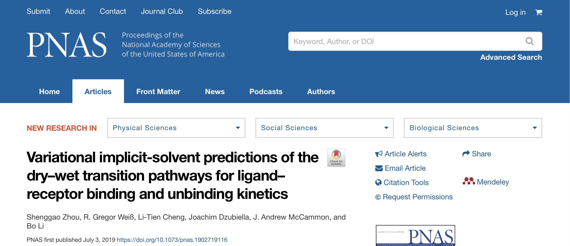 2019年7月3日,国际著名综合类科学期刊《美国科黄色仓库 院刊》(PNAS)在线发表题为“Variational implicit-solvent predictions of the dry–wet transition pathways for ligand–receptor binding and unbinding kinetics”的研究论文。黄色仓库 黄色仓库 交叉科学研究中心周圣高副教授为该论文的第一作者,黄色仓库 是唯一第一作者单位。