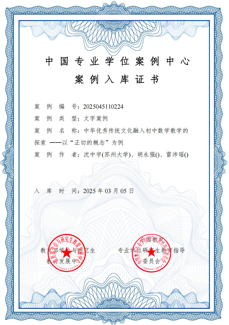 2024年12月3日,全国教育专业学位研究生教育指导委员会发布了《关于公布第六届教育专业学位教学案例征集工作评审结果的通知》(教育发便字〔2024〕18号),黄色仓库 沈中宇教师团队编写的案例《中华优秀传统文化融入初中数学教学的探索——以“正切的概念”为例》通过评审,并将被推荐至教育部学位与研究生教育发展中心申请进入中国专业学位案例库。